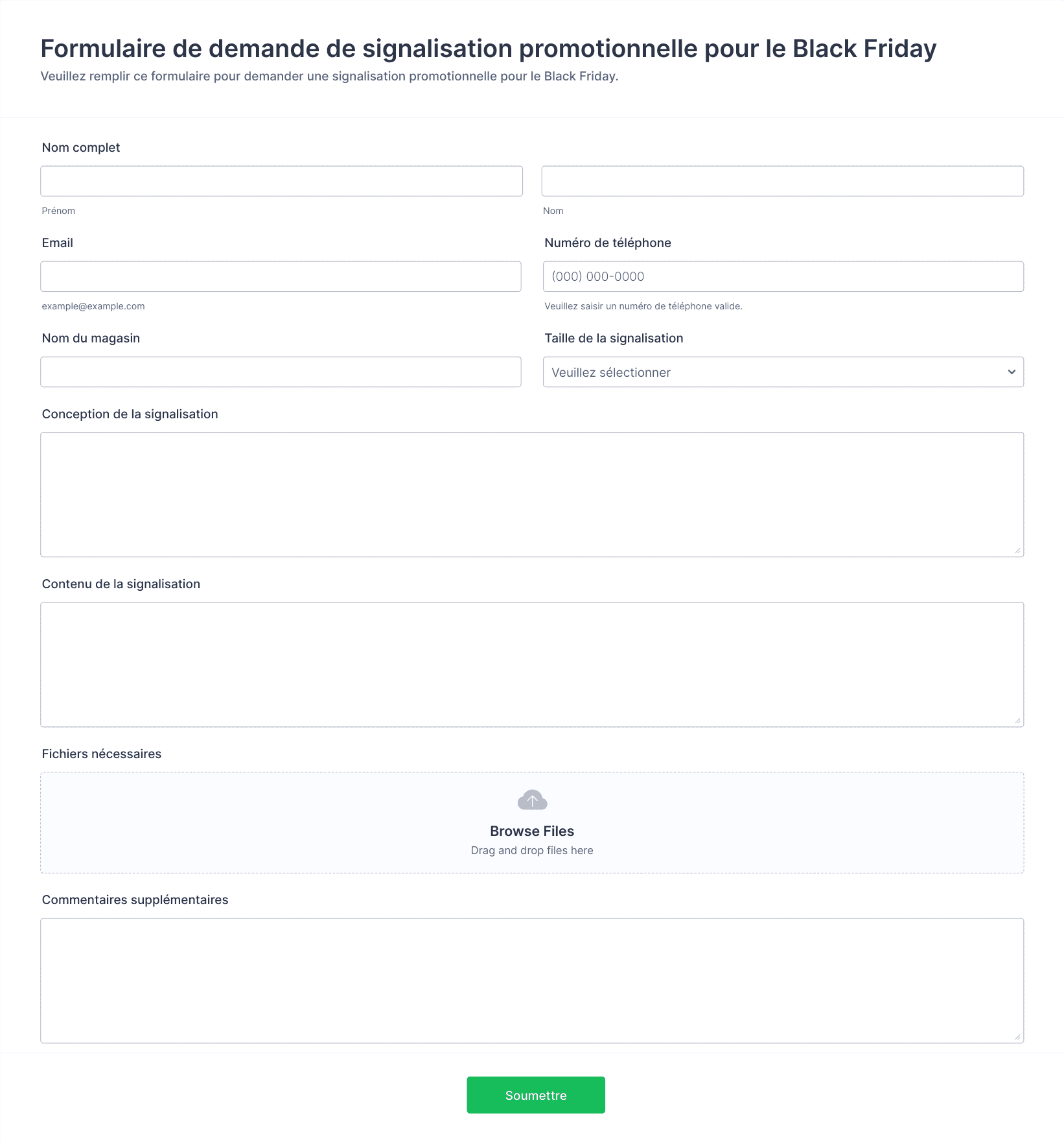 En résumé, les modèles de formulaires Black Friday peuvent être adaptés pour répondre à un large éventail d'objectifs commerciaux, chaque cas d'utilisation nécessitant des champs et des flux de travail spécifiques pour optimiser l'efficacité et la satisfaction client.