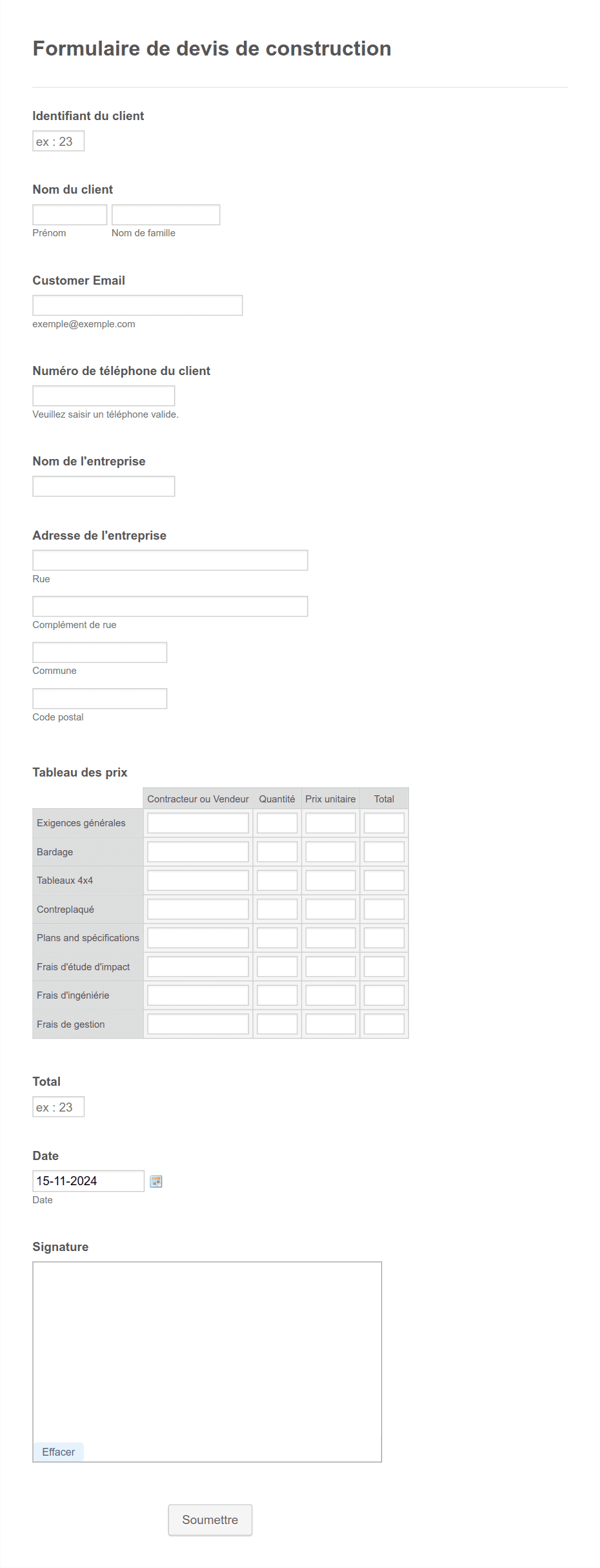 Un modèle de formulaire d'affaire est un formulaire numérique prêt à l'emploi qui permet de collecter, traiter et gérer des informations pour diverses opérations commerciales, telles que la prise en charge de clients, l'accueil de nouvelles recrues ou le traitement des commandes.
