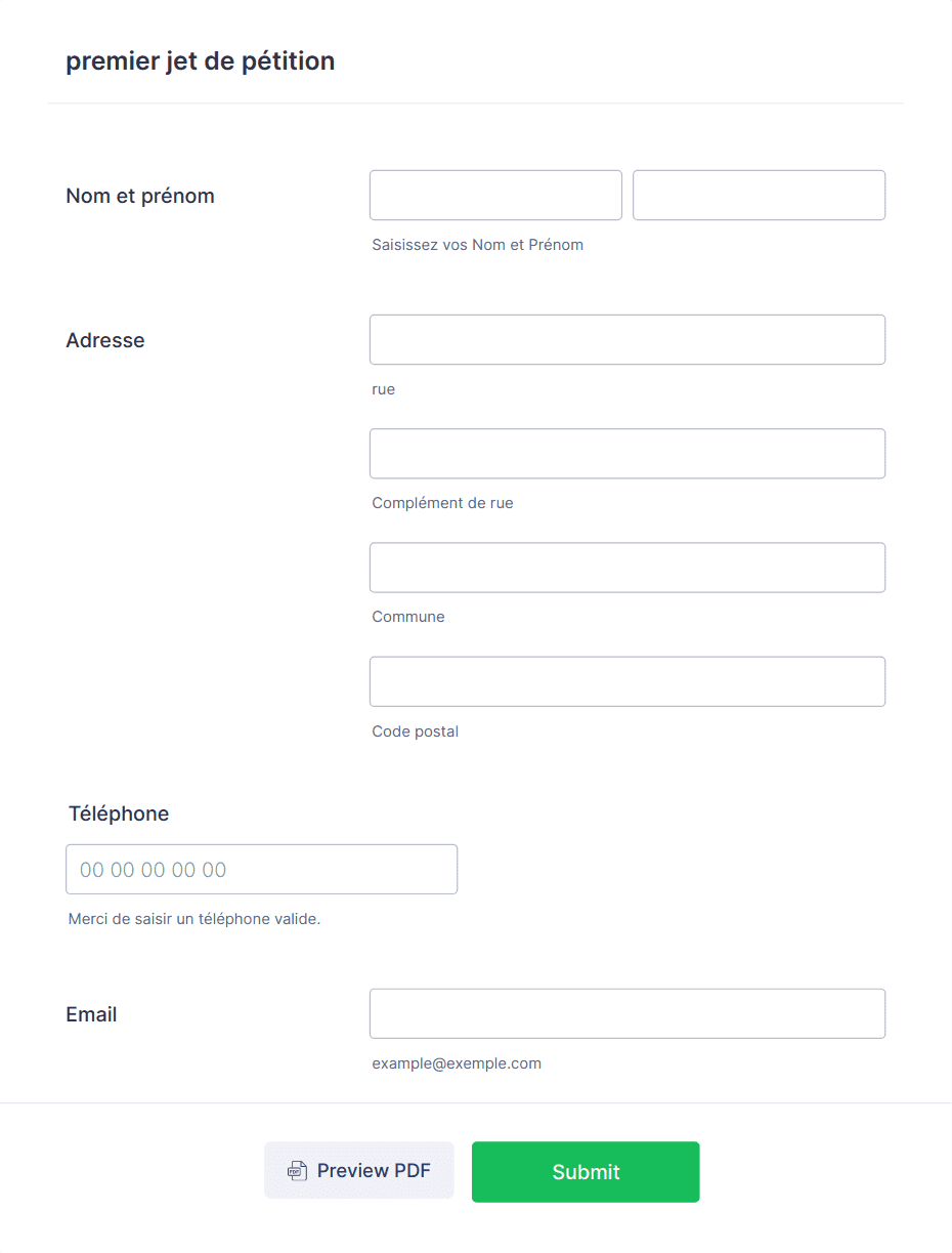 - Adresse ou localisation (en particulier pour les pétitions communautaires ou locales)