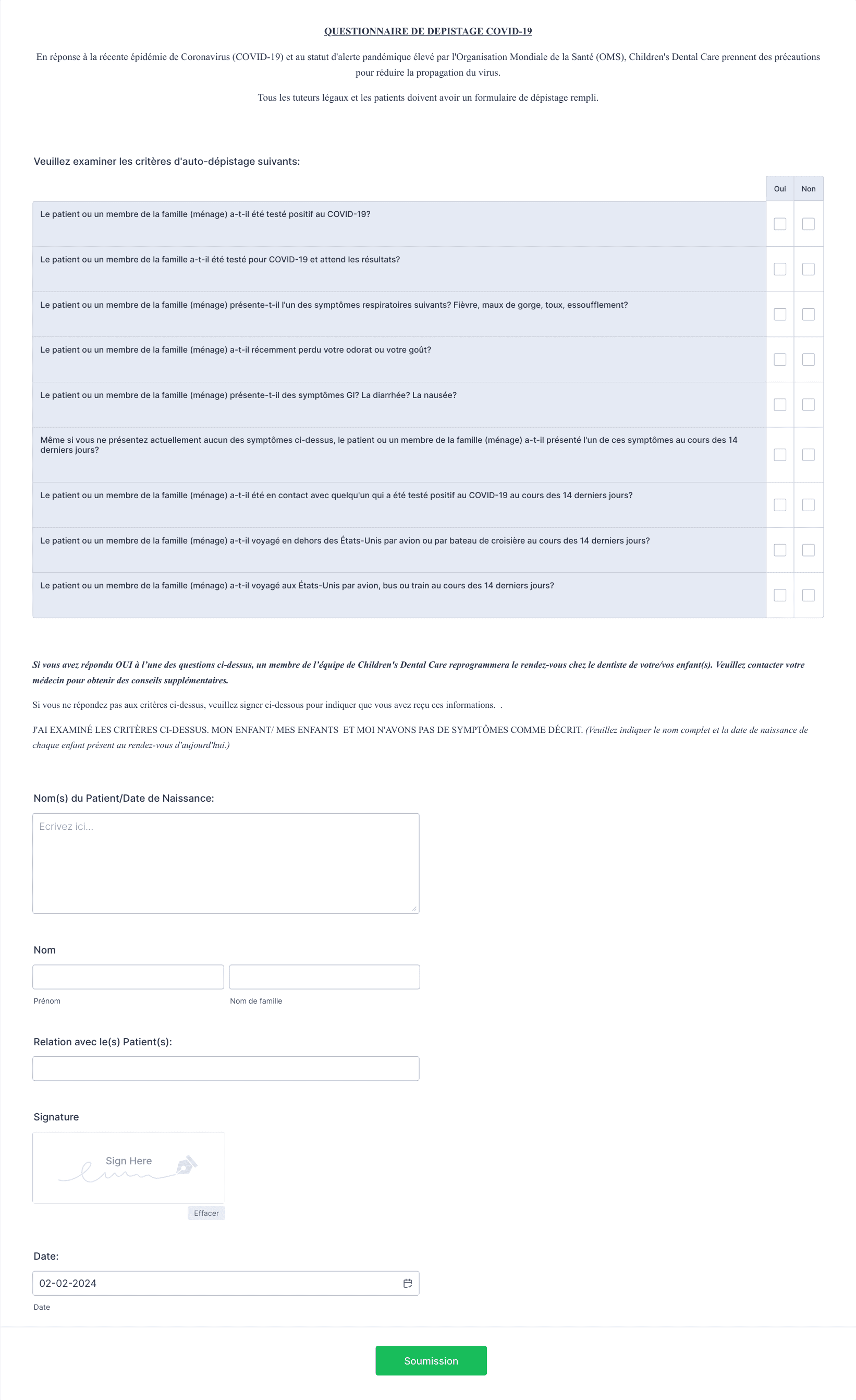 Le Formulaire de Décharge de Responsabilité COVID-19 donne le consentement des patients pour accepter chaque déclaration et décharge de toute responsabilité pour l'exposition involontaire ou les dommages dus au COVID-19.