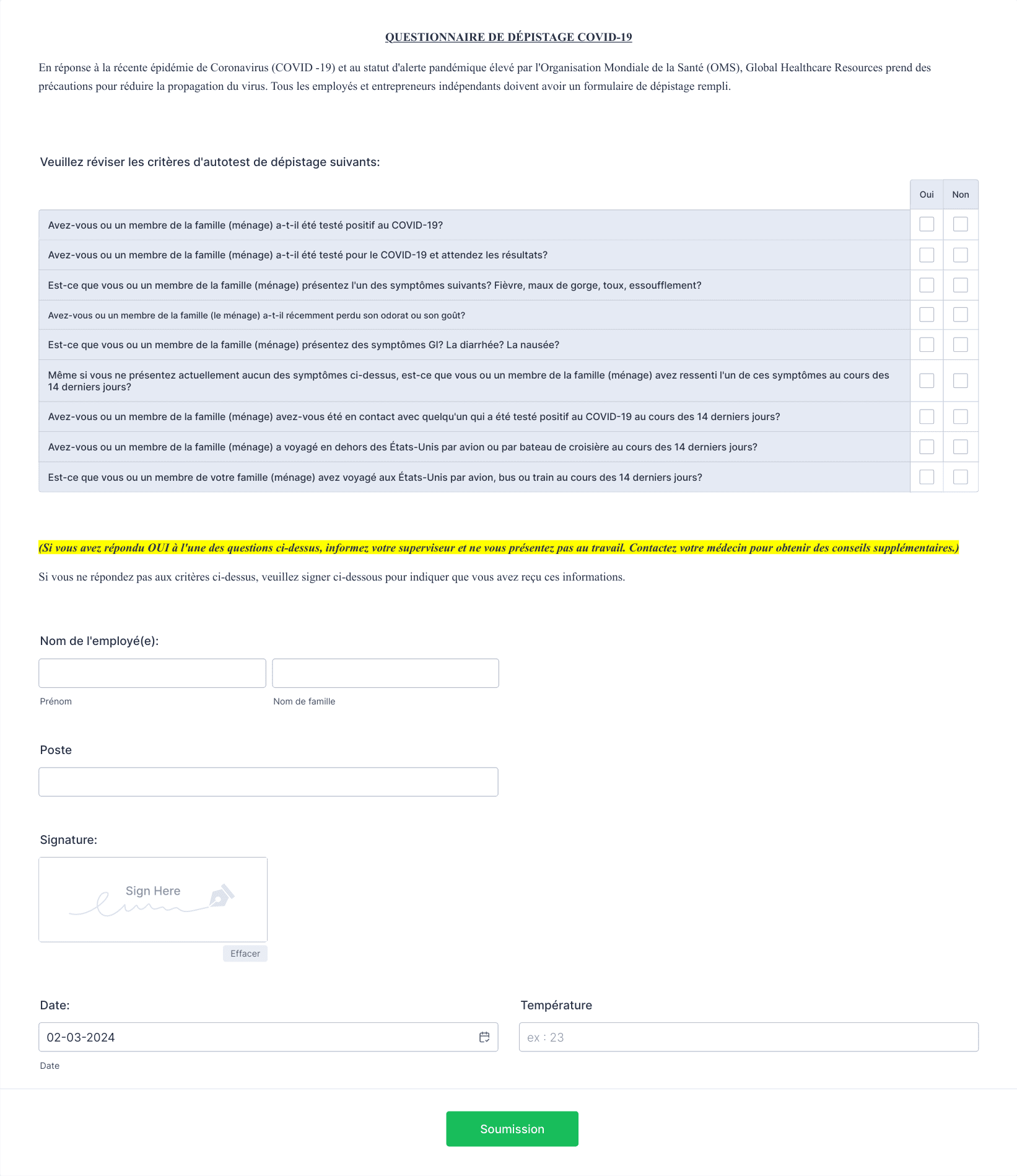 Un Formulaire d'Auto-Evaluation sur Coronavirus est rempli par les patients pour informer un hôpital ou un cabinet médical de tout symptôme de coronavirus qu'ils peuvent avoir. En collectant les coordonnées du patient, les coordonnées d'urgence, les symptômes et les informations d'exposition au coronavirus avec un Formulaire d'Auto-Evaluation sur Coronavirus en ligne, vous pouvez franchir une étape importante dans le diagnostic des patients atteints de COVID-19. Pour commencer, personnalisez simplement le formulaire, envoyez-le à vos patients et recevez instantanément leurs soumissions dans votre compte Jotform sécurisé. Ce Formulaire d'Auto-Evaluation sur Coronavirus est déjà équipé des questions de santé importantes, mais n'hésitez pas à en ajouter plus avec notre Générateur de Formulaires par glisser-déposer. Cela ne prend que quelques minutes pour que votre formulaire ressemble et fonctionne comme vous en avez besoin. Et si vous avez besoin de relayer automatiquement les réponses à vos autres comptes, utilisez nos + de 100 intégrations gratuites. En permettant à vos patients de remplir ce Formulaire d'Auto-Evaluation sur Coronavirus en ligne gratuit à distance sur n'importe quel appareil, vous pouvez plus facilement diagnostiquer et traiter les patients atteints de coronavirus tout en protégeant vos equipes.