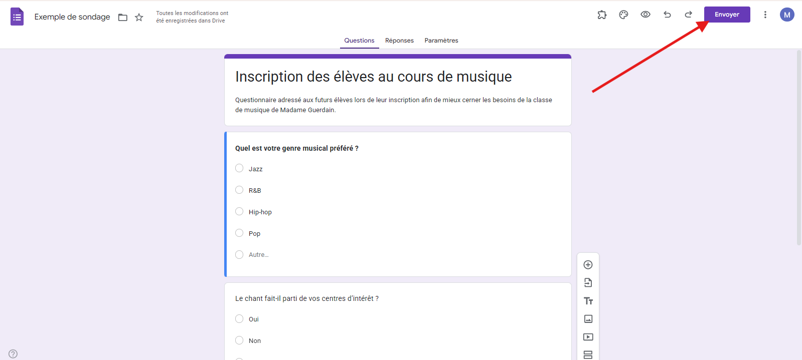- Une fois que votre formulaire Google est prêt à être envoyé, cliquez sur le bouton Envoyer dans le menu en haut à droite.
