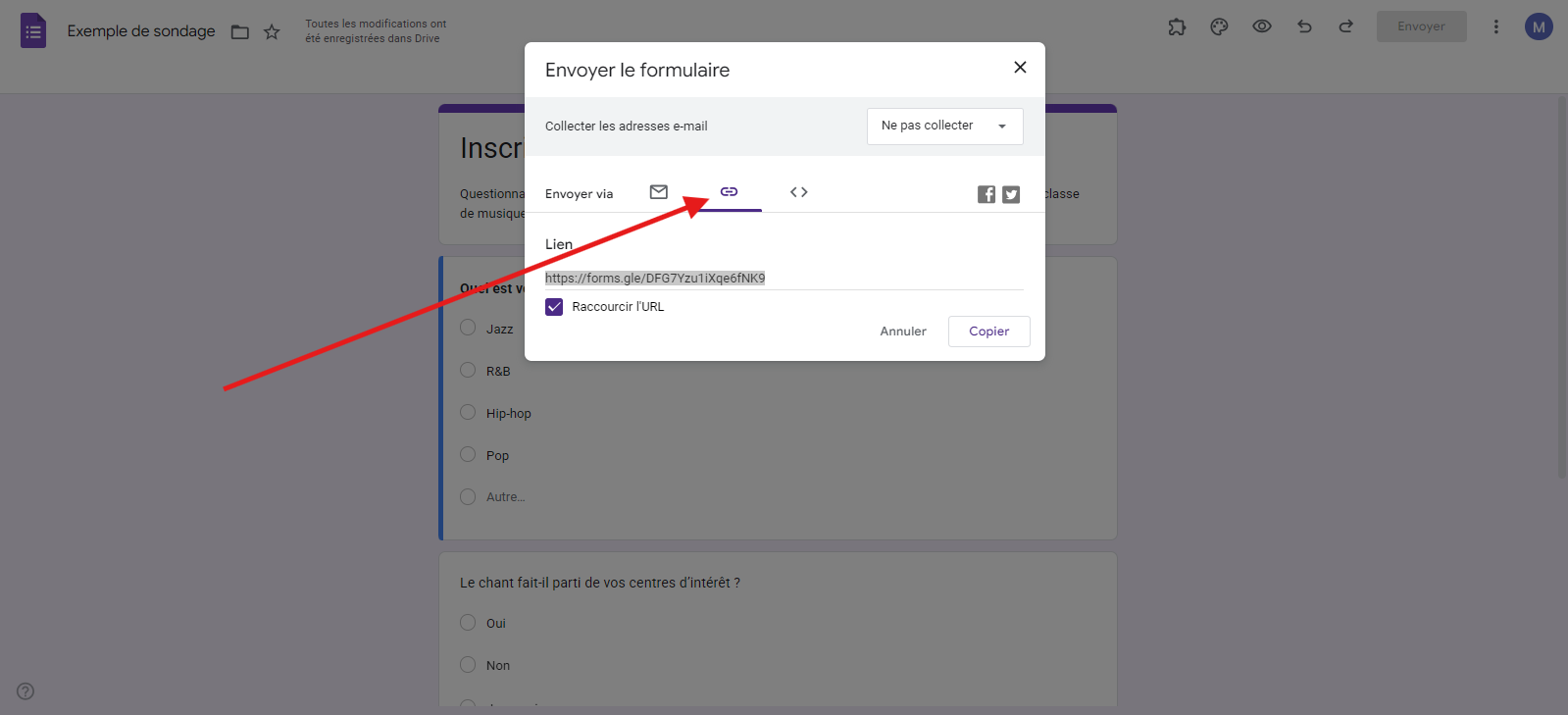 - Vous pouvez raccourcir le lien en cochant la case Raccourcir l’URL si vous le souhaitez.