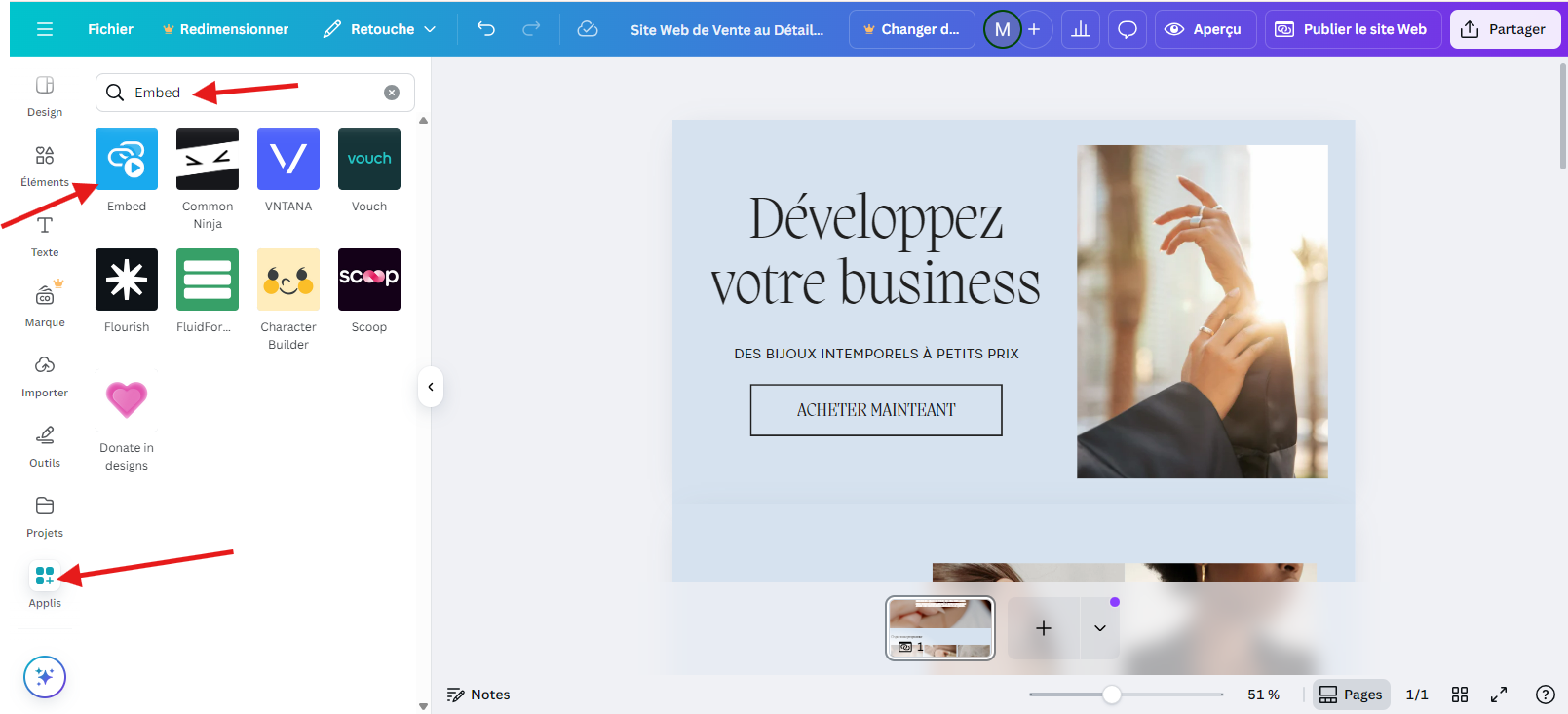 - Cliquez sur Applications et saisissez Embed dans le champ de recherche.