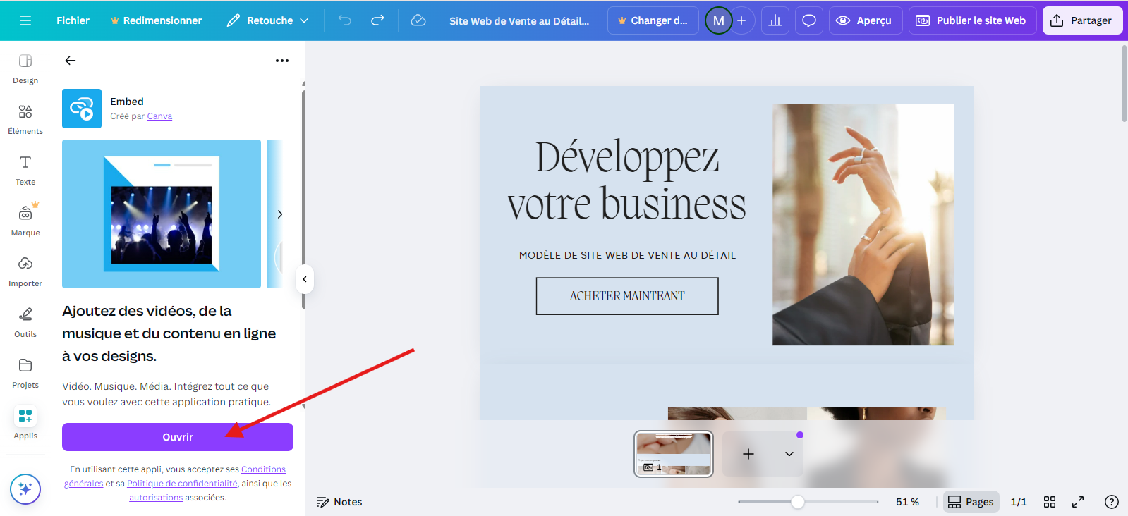 - Cliquez sur le bouton Ouvrir dans l’application Embed.