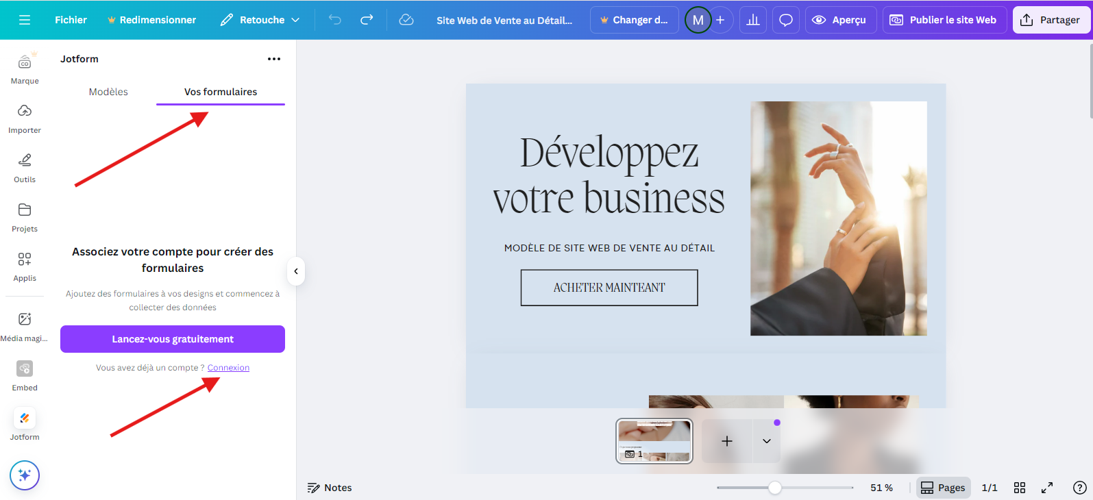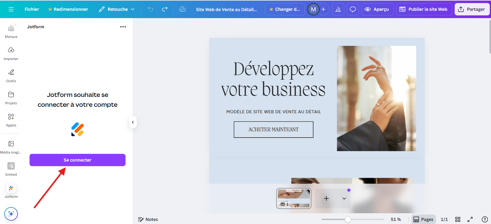 - Lorsque votre formulaire est prêt à être partagé, connectez-vous à votre compte Canva et ouvrez votre site web dans l’éditeur.