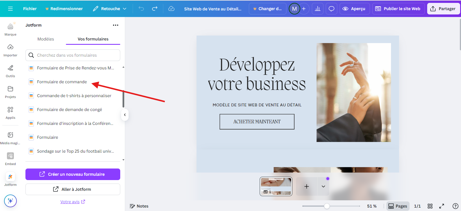 - Après avoir connecté votre compte Jotform à Canva, choisissez le formulaire que vous souhaitez ajouter à votre site web en cliquant sur votre formulaire dans le menu.