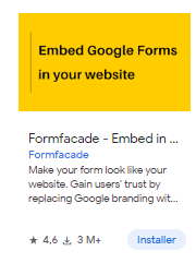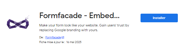 Dans la fenêtre contextuelle de Google Workspace Marketplace, recherchez Formfacade. Cliquez sur Formfacade, puis sur Installer.