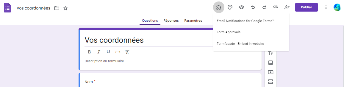 Il peut falloir quelques minutes pour que le menu Formfacade devienne disponible. Vous devrez peut-être aussi recharger la page de votre formulaire. Si ce module complémentaire n’apparaît pas, essayez d’abord de recharger la page, puis patientez quelques instants.