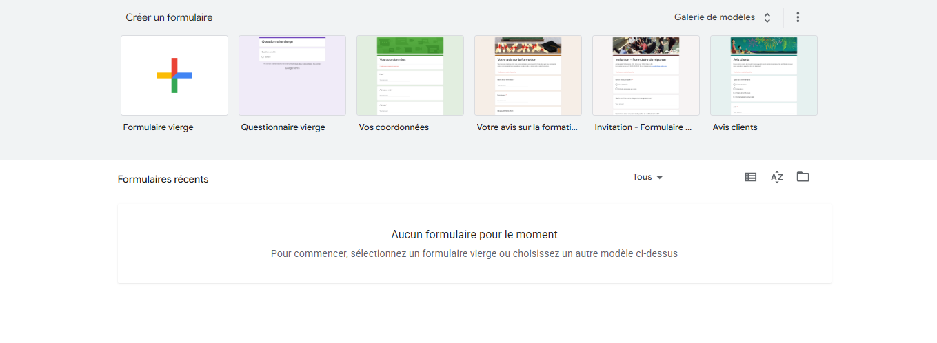 Pour un démarrage rapide, Google Forms propose un large éventail de modèles, notamment des formulaires de candidature, des formulaires d’inscription à des événements, des formulaires de feedback client, et bien d’autres encore. Pour accéder à la galerie de modèles, cliquez simplement sur le bouton « Galerie de modèles » situé en haut à droite de la page. Une fois que vous avez trouvé un modèle qui vous convient, cliquez dessus et n’oubliez pas de personnaliser le formulaire selon vos besoins.
