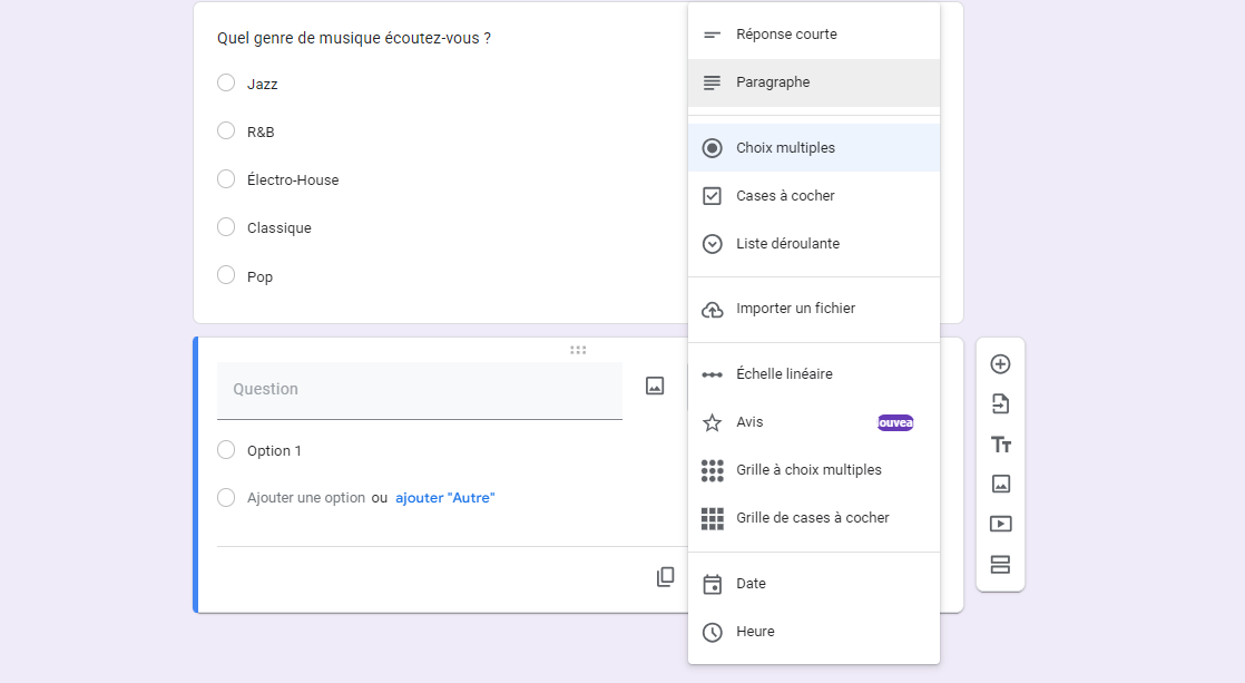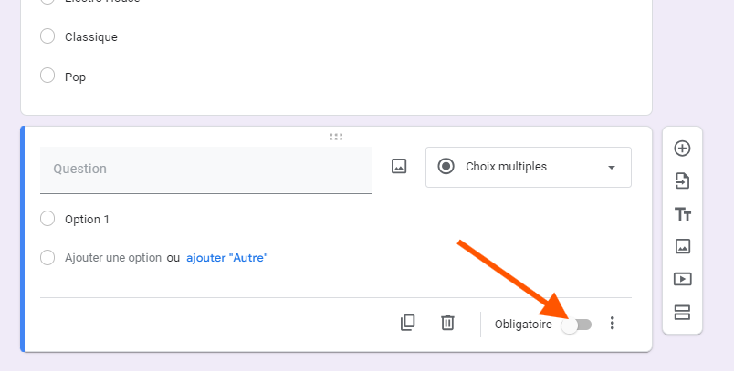 Ajoutez vos questions de sondage en cliquant sur le bouton + Ajouter une question dans le menu vertical à droite du premier champ de question.