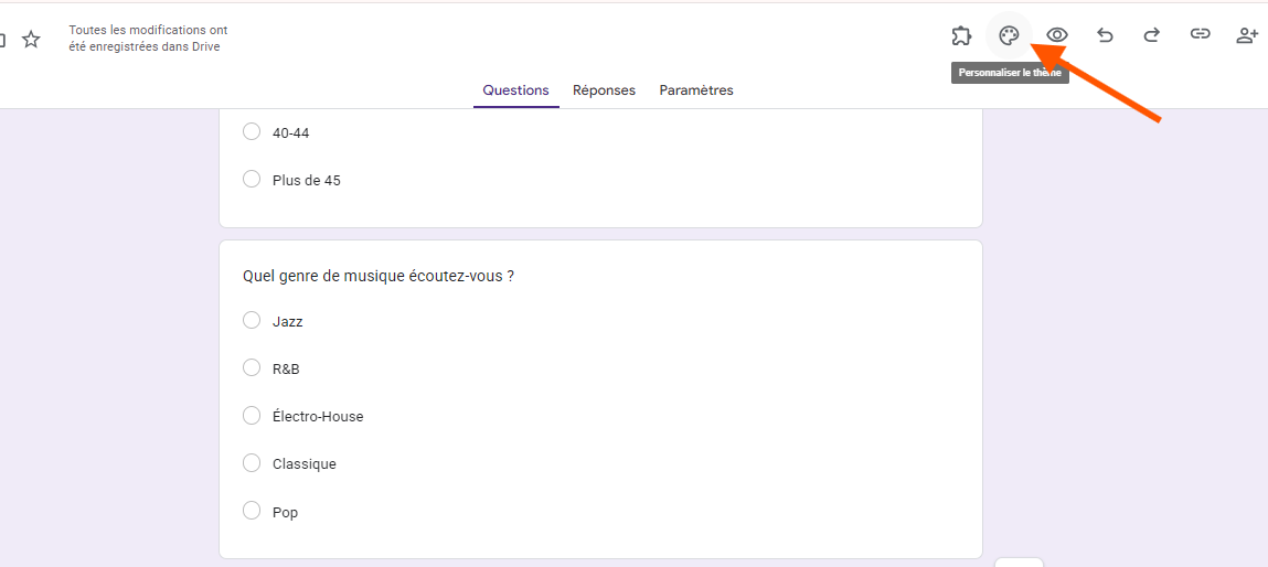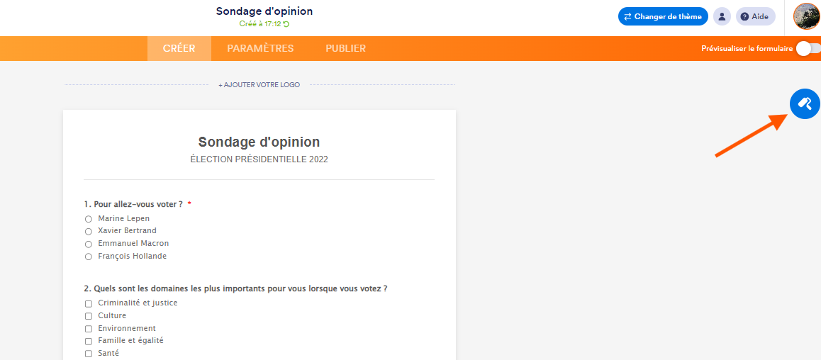 Cliquez sur l’icône de palette en haut à droite pour personnaliser le thème de votre sondage. Modifiez les polices et les couleurs ou ajoutez une image d’en-tête pour rendre votre sondage plus attrayant.