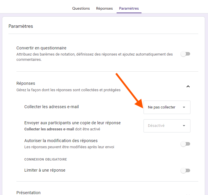 Vous pouvez également rendre votre sondage anonyme en ne collectant pas les adresses email. Les répondants peuvent se sentir plus ouverts à partager leurs opinions avec cette option. Pour ce faire, cliquez sur l’onglet Paramètres en haut, puis développez la section Réponses. Désactivez l’option Collecter les adresses e-mail.
