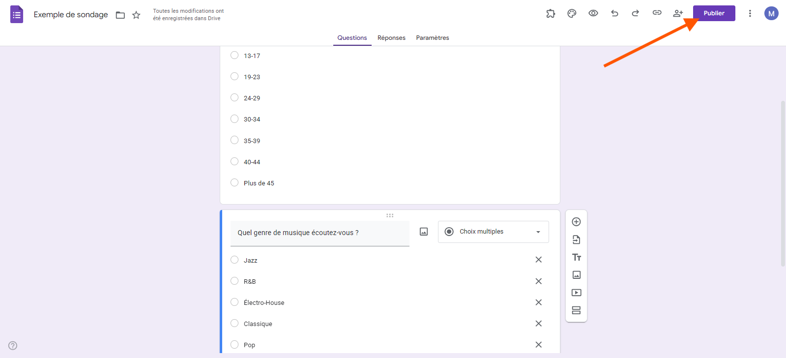 Partager votre sondage est un jeu d’enfant. Avant que les répondants puissent accéder à votre formulaire, il doit être publié. Pour ce faire, cliquez sur le bouton Publier situé dans le coin supérieur droit de votre écran. Une fois votre formulaire prêt, vous pouvez le partager par e-mail, sur les réseaux sociaux ou en l’intégrant sur un site ou un blog.