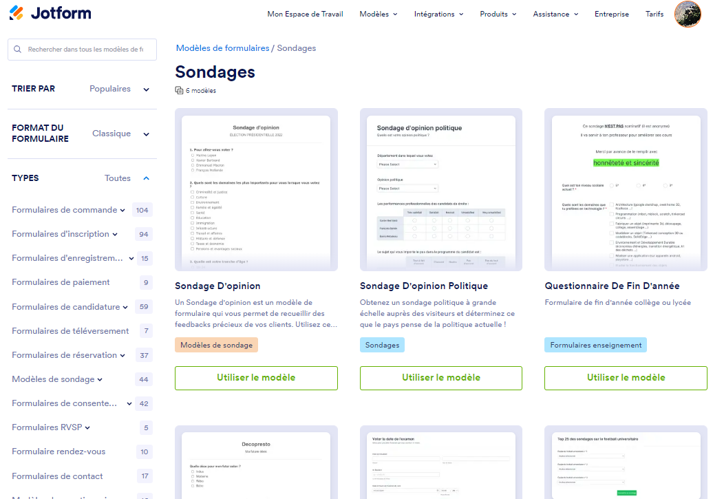 Contrairement à Google Forms, Jotform propose plus de 50 modèles préétablis que vous pouvez utiliser pour créer un sondage rapidement. Que vous souhaitiez créer un sondage d’opinion, un sondage en classe ou un sondage politique, il est facile de commencer avec Jotform.