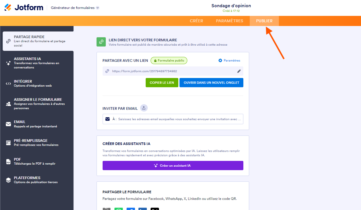 - Partagez le formulaire avec les utilisateurs en cliquant sur l’onglet Publier pour l’envoyer par email, créer un lien ou un QR code, ou bien le partager sur les réseaux sociaux.