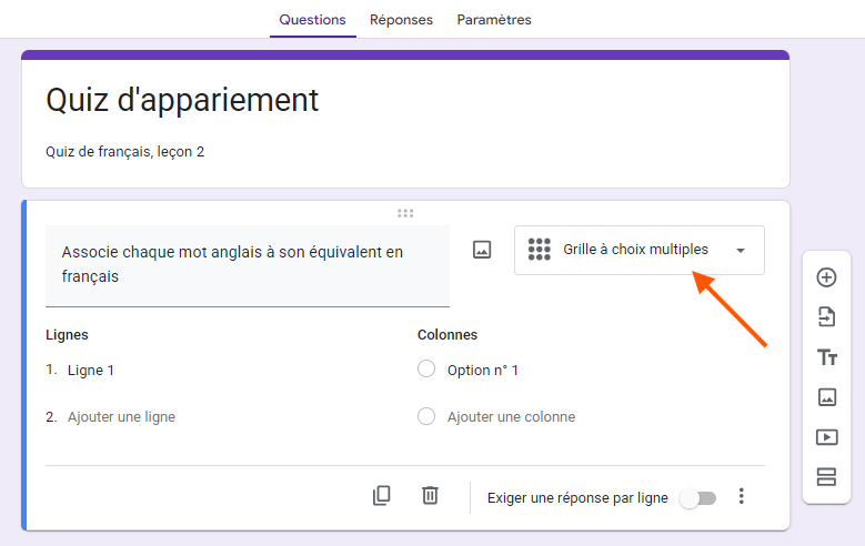 - Pour une question à appariement où un élément d’une ligne correspond à un seul élément dans une colonne, sélectionnez Grille à choix multiples.