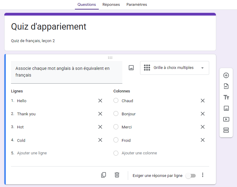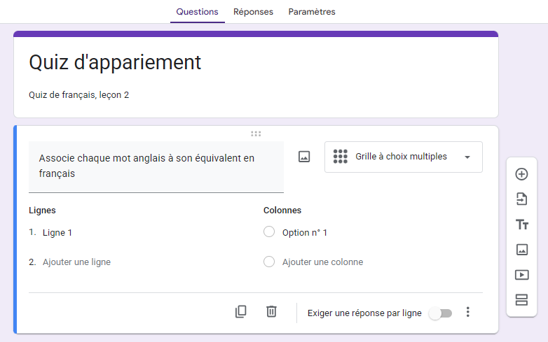Créer une question à appariement dans Google Forms est complexe, car ce type de question n’est pas proposé dans la liste déroulante des types de question. Dans les instructions ci-dessous, découvrez une solution de contournement, qui vous permet de résoudre ce problème en créant essentiellement une grille servant de question à appariement :