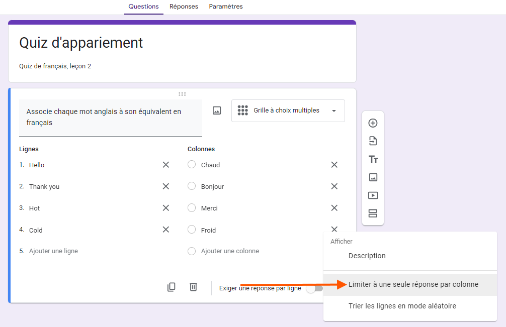 - Cliquez sur Plus d’options (les trois points verticaux en bas à droite de la question). Sélectionnez Limiter à une seule réponse par colonne.