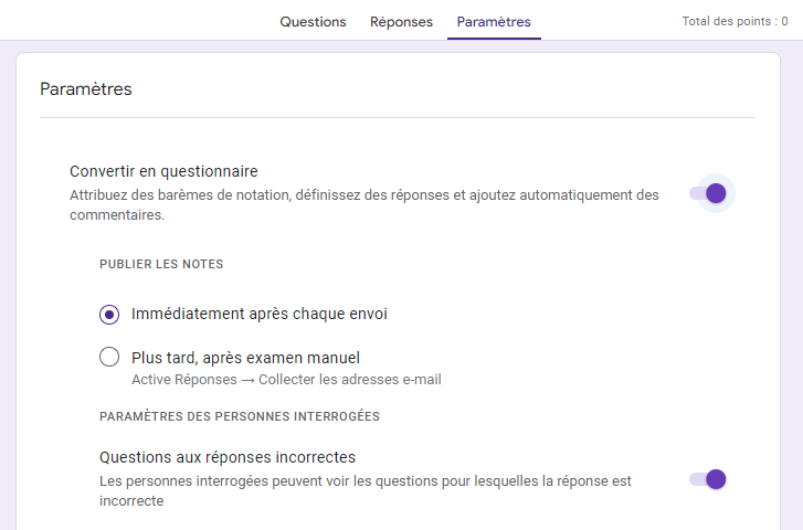 - Sélectionnez Convertir en questionnaire et choisissez les paramètres souhaités.