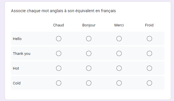 Cependant, un type de question courant, à savoir la question à appariement, n’est malheureusement pas disponible dans Google Forms. Mais heureusement, nous avons une solution simple que vous pouvez mettre en œuvre dès aujourd’hui… Poursuivez votre lecture !