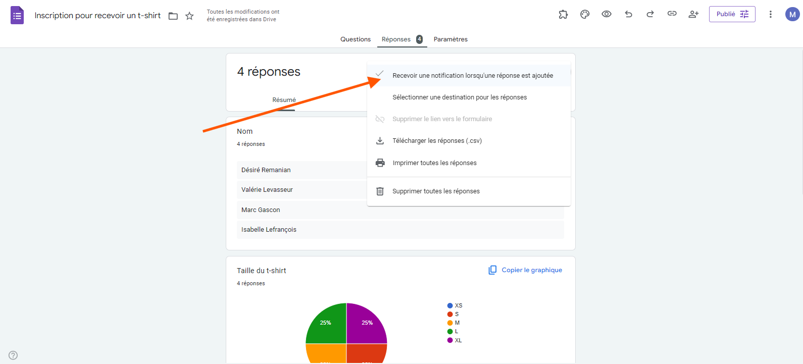 De plus, seulement vous (l’auteur du formulaire) recevrez les notifications. Si vous souhaitez que vos collègues reçoivent aussi des notifications, vous devrez les ajouter en tant que collaborateurs dans le formulaire et leur demander d’activer les notifications par email.