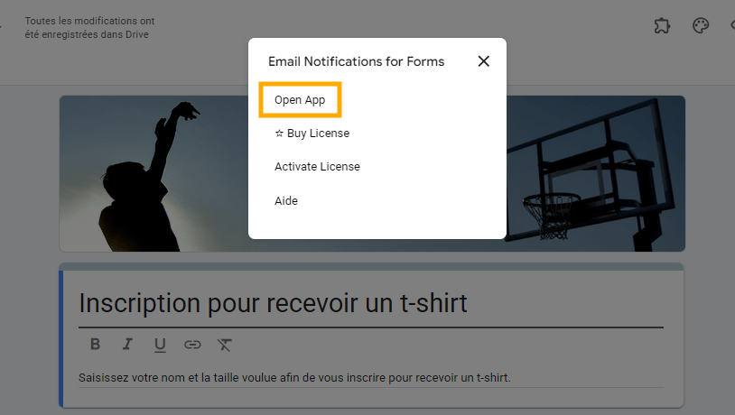 - Accédez à votre formulaire et cliquez sur l’icône des modules complémentaires (la pièce de puzzle). Cliquez sur Email Notifications for Forms puis sur Ouvrir l’application.