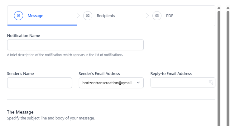 - Saisissez un nom pour votre notification afin de la reconnaître facilement. Ajoutez toutes les adresses email auxquelles vous souhaitez envoyer des notifications (par exemple, votre équipe de support client), ainsi qu’un nom et une adresse email d’expéditeur.