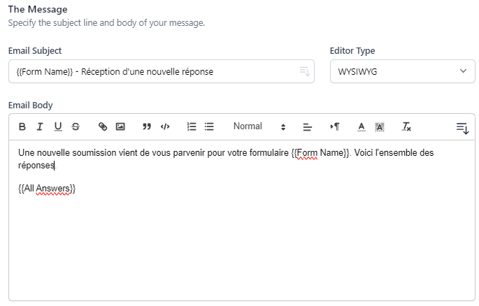- Saisissez l’objet et le message du corps de la notification par email. Vous pouvez utiliser la variable {{All Answers}} pour inclure tous les champs du formulaire.