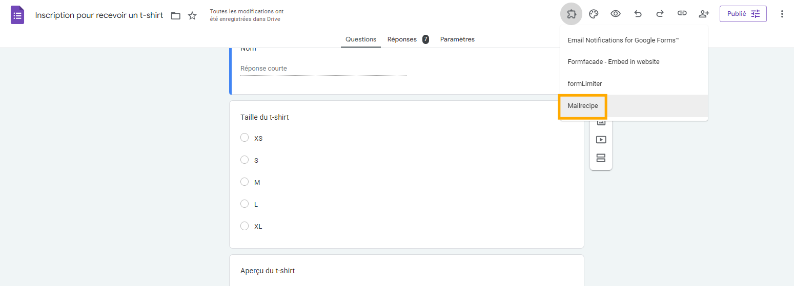 - Ouvrez votre formulaire, cliquez sur l’icône Modules complémentaires, puis cliquez sur Mailrecipe.