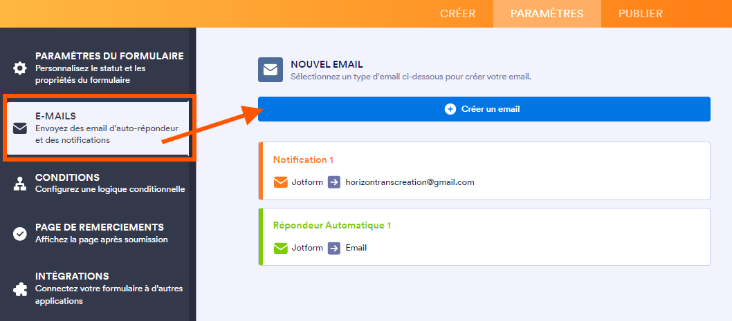 Jotform facilite également l’envoi de notifications automatiques par email dès qu’un répondant soumet un formulaire. Il suffit de suivre ces étapes :