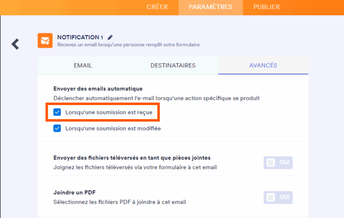 Les notifications par email sont fournies avec un modèle prêt à l’emploi personnalisable, mais tous les champs de réponse sont affichés dans l’email par défaut. Vous pouvez ajouter des destinataires spécifiques sous l’onglet Destinataires. Dans l’onglet Avancés, assurez-vous que l’option Lorsqu’une soumission est reçue est cochée pour garantir que tous les collaborateurs et répondants reçoivent des notifications.