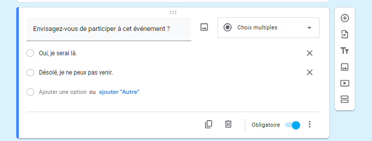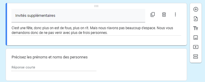 Si vous réorganisez les questions ou les sections de votre formulaire, assurez-vous de vérifier que l’enchaînement reste logique. Cliquez sur l’icône Aperçu en haut à droite pour vous assurer que les questions ont toujours du sens dans leur nouvel ordre.