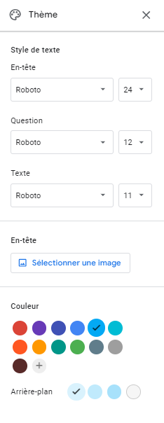 Cette action ouvre un menu affichant toutes les options de thème disponibles. La première section vous permet de choisir le style et la taille de la police pour l’en-tête du formulaire, les questions et l’ensemble du texte.