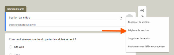 Pour déplacer une section entière de questions dans votre formulaire, cliquez sur les trois points situés en haut à droite de la section, puis sélectionnez Déplacer la section.