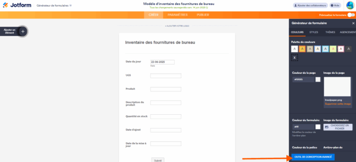 De plus, Jotform offre beaucoup plus d’options de style que Google Forms, notamment un plus grand choix de polices, de couleurs et de mises en page. Il existe même une option Outil de conception avancé, pour un contrôle plus précis de l’apparence de votre formulaire.
