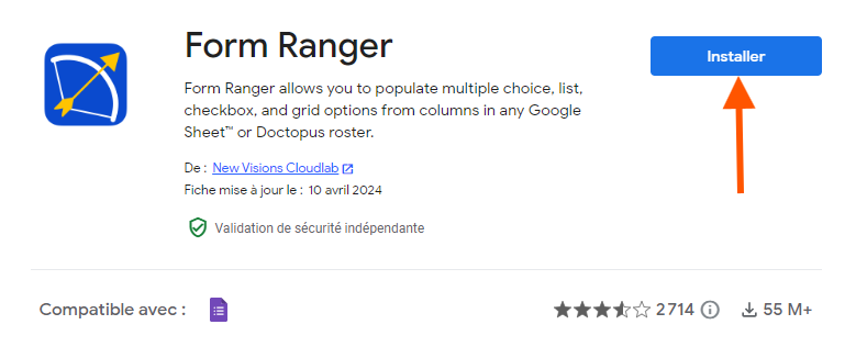 - Accédez à la page du Google Workspace Marketplace et recherchez Form Ranger, puis cliquez sur le bouton Installer.