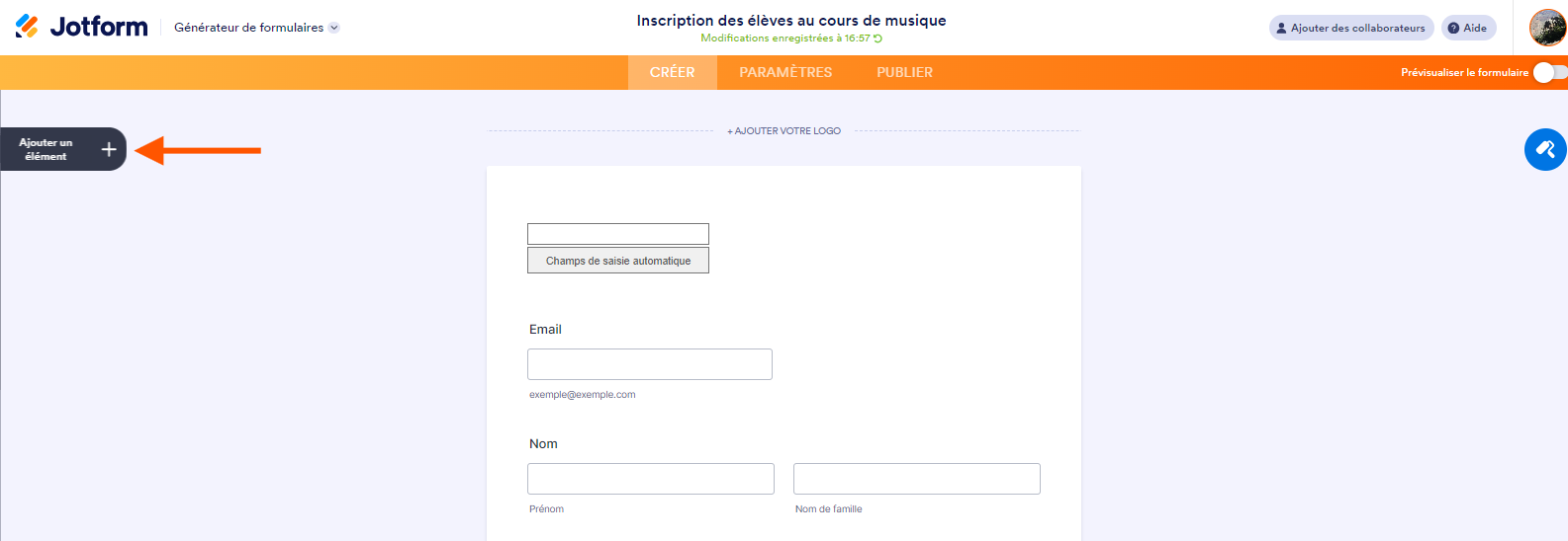 - Cliquez sur le bouton Ajouter un élément sur le côté gauche dans le Générateur de formulaires Jotform.