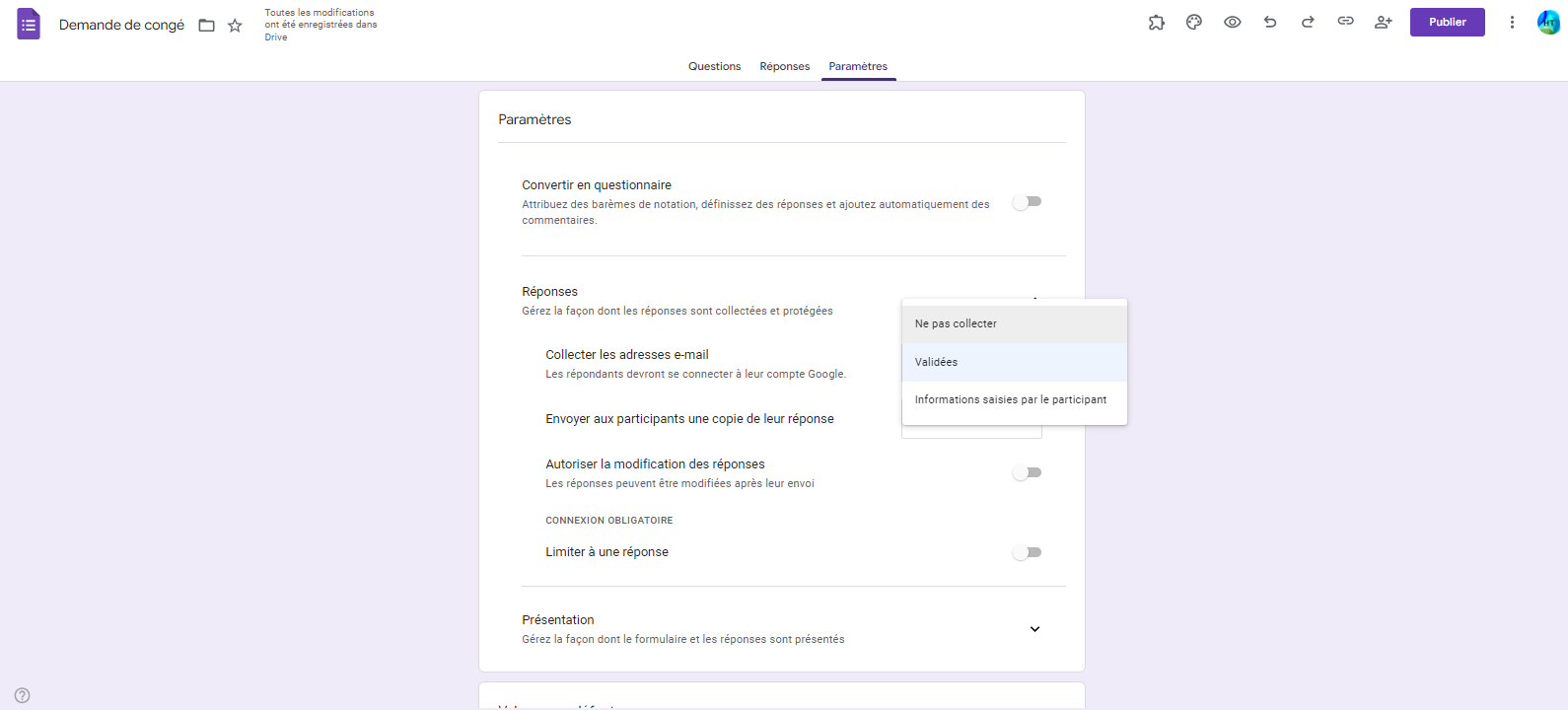 - Retournez dans votre formulaire Google, puis cliquez sur Réponses dans l’onglet Paramètres