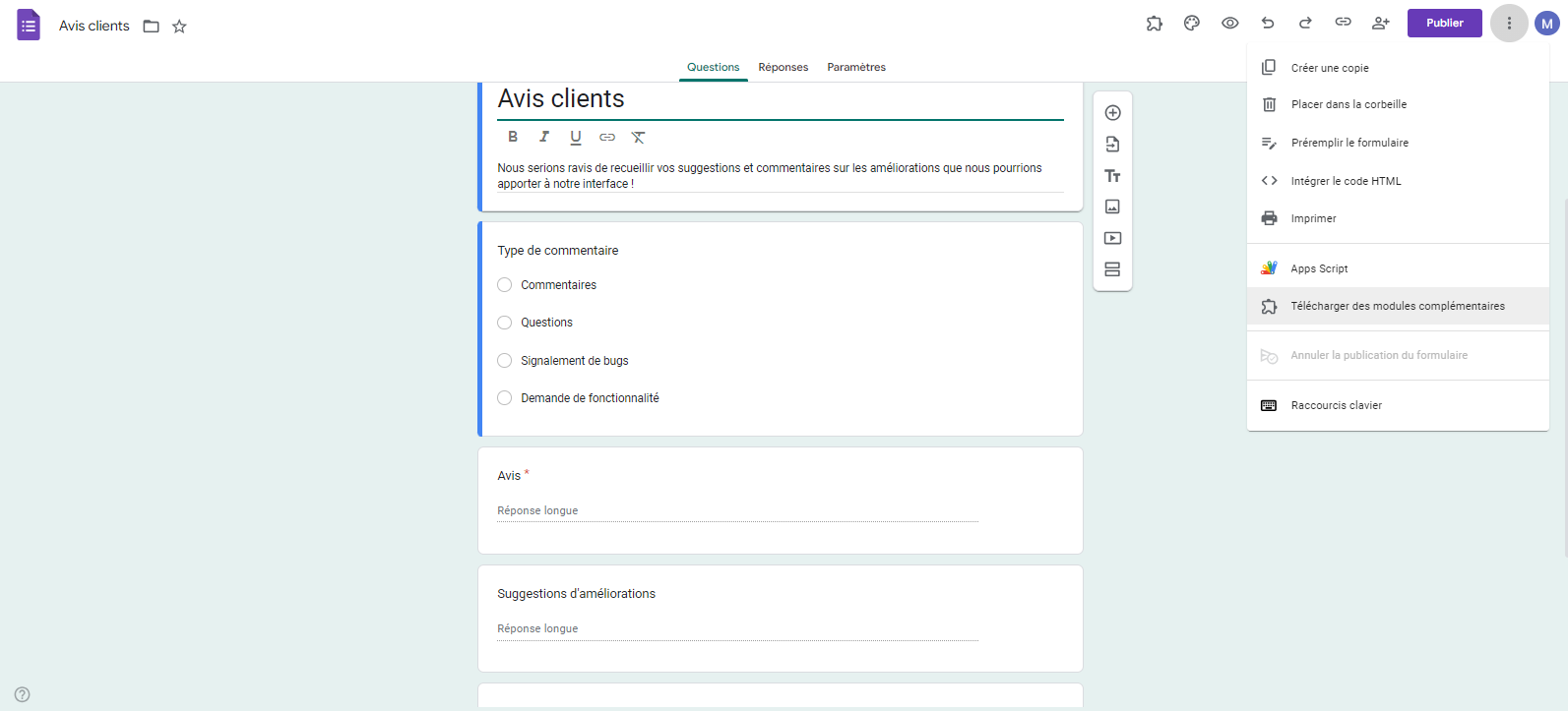 - Sélectionnez le menu Autres en cliquant sur les trois points verticaux dans le coin supérieur droit de votre formulaire.
