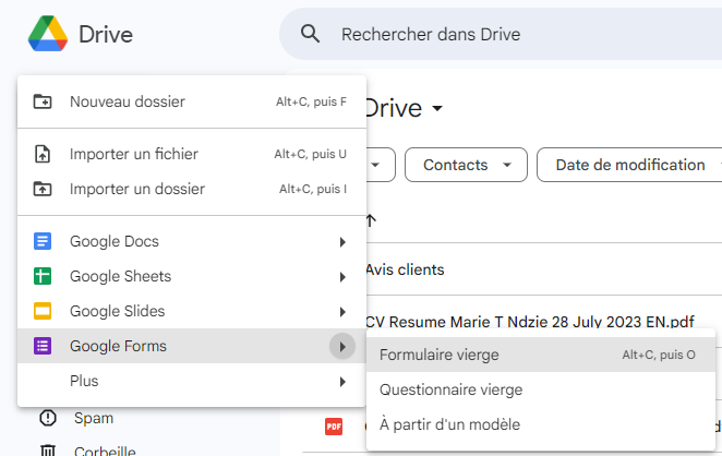 - Passez la souris sur la flèche à côté de Google Forms dans le menu déroulant. Vous verrez trois options : Formulaire vide, Quiz vide, ou À partir d’un modèle.