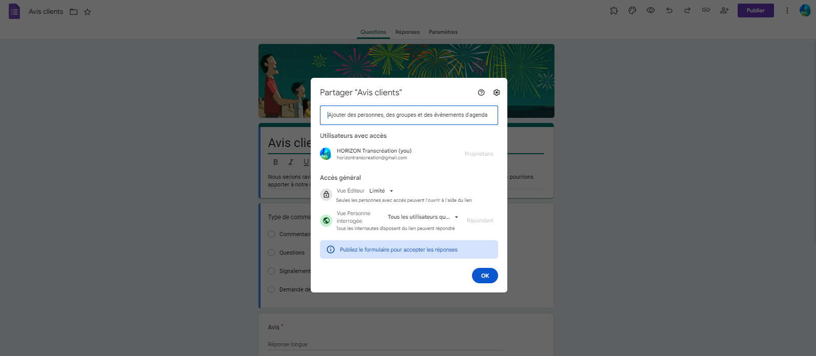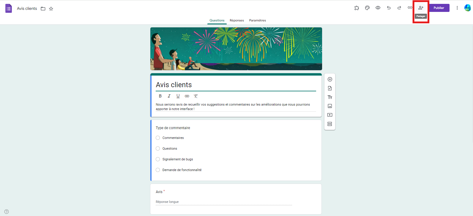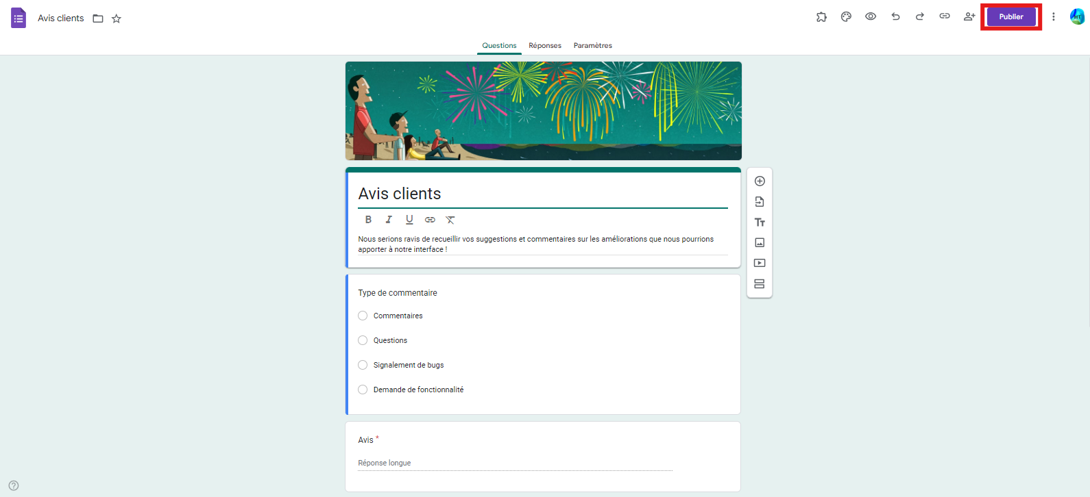 - Une fois le formulaire personnalisé, cliquez sur Publier en haut à droite pour que les répondants puissent y accéder.