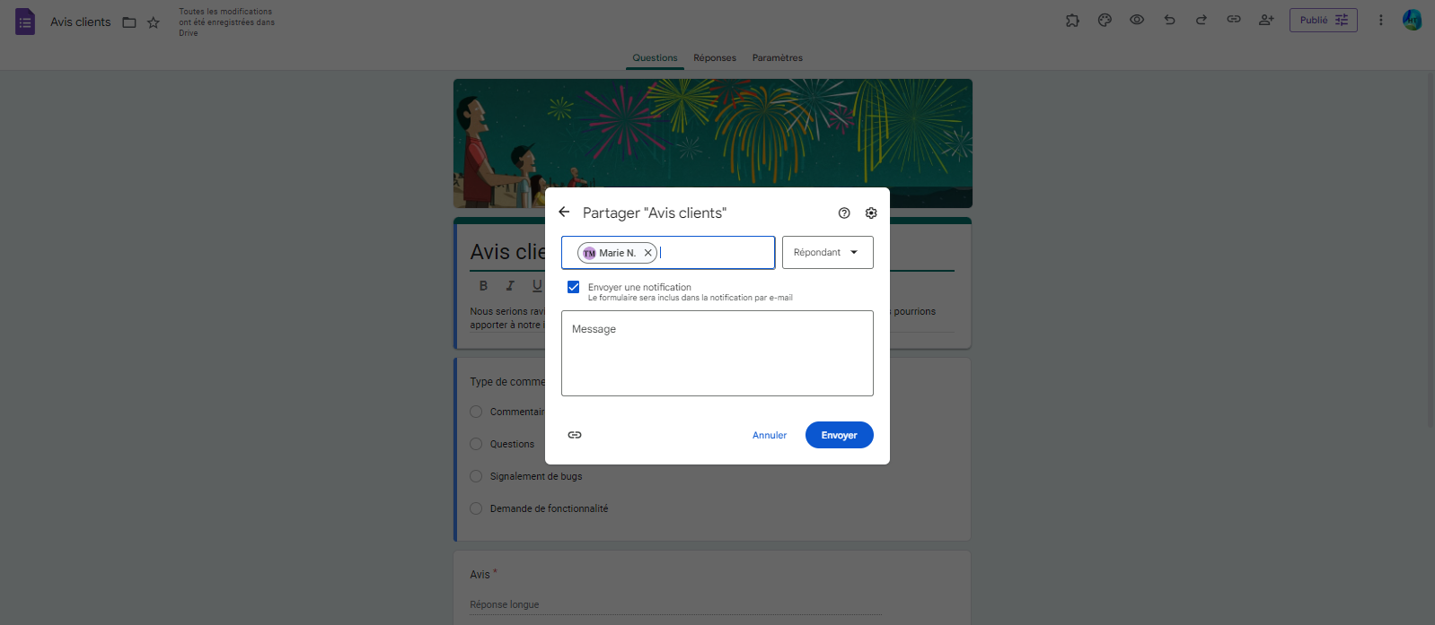- Pour envoyer automatiquement le formulaire dans une notification par email lors du partage, cochez la case à côté de Notifier les personnes. Lors de la notification des répondants à la publication du formulaire, l’email envoyé inclura le formulaire.