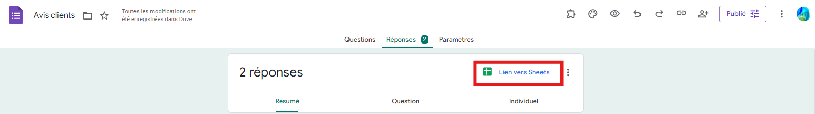 Les réponses à votre formulaire seront désormais immédiatement ajoutées à la feuille de calcul Google Sheets que vous avez sélectionnée.
