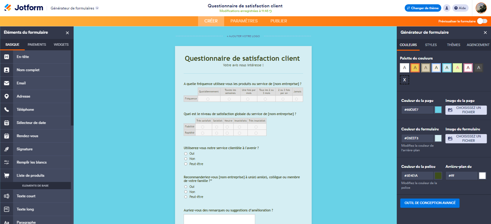 - Personnalisez le formulaire en ajoutant votre logo, en modifiant ses couleurs et polices pour qu’elles correspondent à votre marque, et plus encore. Par glisser-déposer, ajoutez des éléments de formulaire depuis le volet de gauche pour ajouter d’autres questions, ou cliquez sur les questions existantes pour les modifier si vous cherchez des retours sur des sujets spécifiques.