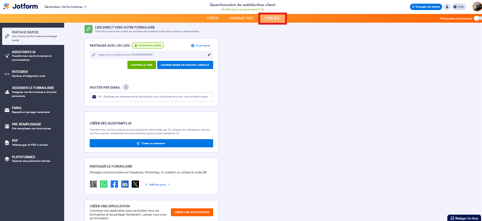- Une fois satisfait de votre formulaire, cliquez sur Publier en haut de l’interface du Générateur de formulaires.