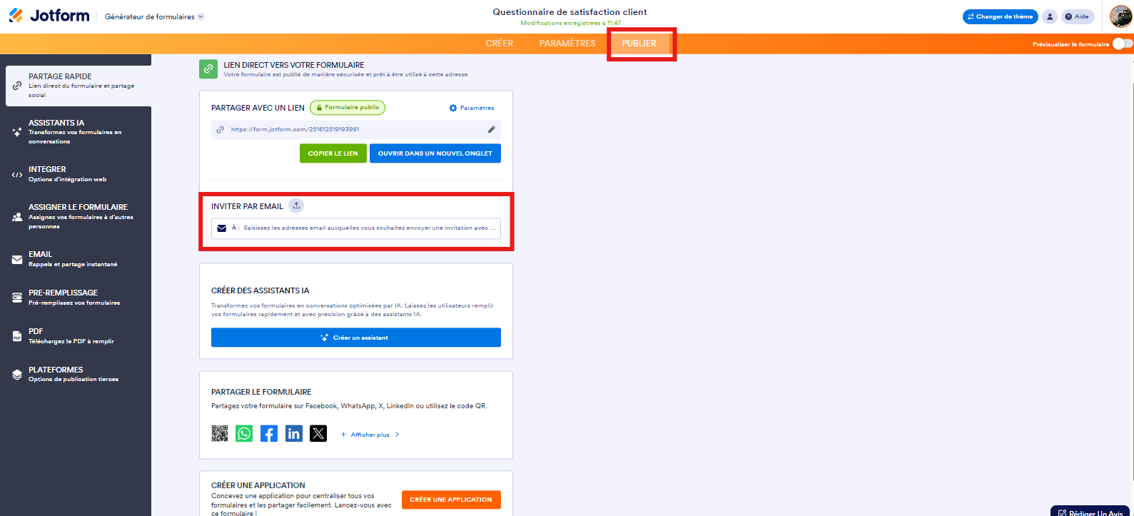 - Sous l’onglet Partage rapide (l’option sélectionnée par défaut lorsque vous accédez à l’interface de partage de votre formulaire), cliquez sur le bouton Copier le lien pour copier l’URL de votre formulaire. Vous pouvez également envoyer un lien vers le formulaire par email dans la section Inviter par email.