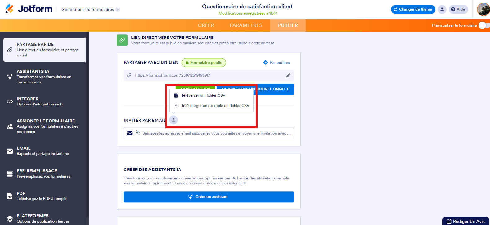 - Si vous envoyez un lien vers le formulaire, collez l’URL du formulaire dans votre email via votre fournisseur de messagerie choisi et envoyez-le. Si vous envoyez le formulaire par email dans Jotform, ajoutez manuellement les adresses des destinataires ou téléversez une liste CSV contenant les adresses email.