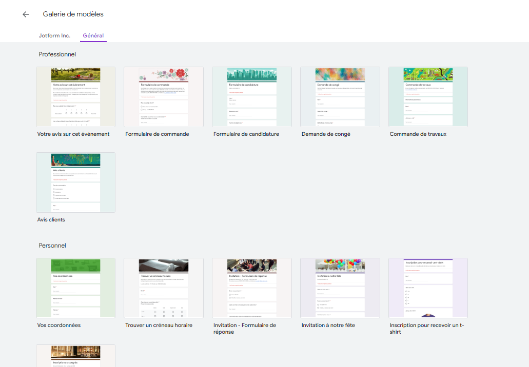 À partir de n’importe quel produit Google, cliquez sur l’icône représentant une grille situé en haut à droite de votre écran, puis sélectionnez l’icône Google Forms dans la bibliothèque d’applications. Sélectionnez Galerie de modèles dans Google Forms. Parcourez la liste des formulaires des différentes catégories : Professionnel, Personnel, Enseignement, et bien d’autres encore, et cliquer sur le modèle qui vous convient.