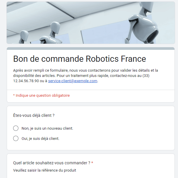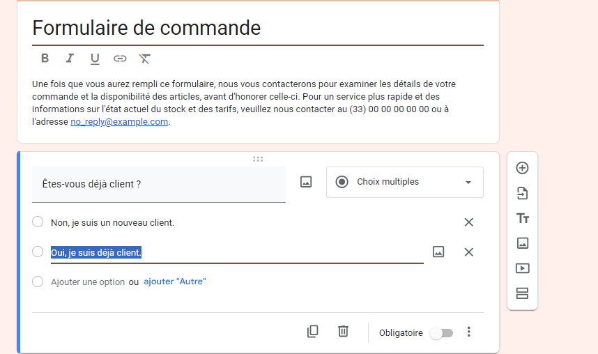 Cliquez dans le titre principal et le texte d’accompagnement de votre formulaire pour modifier son contenu. De même, vous pouvez cliquer dans chaque question pour changer le type de question ou les options de réponse proposées, ou pour modifier le texte affiché dans la question.